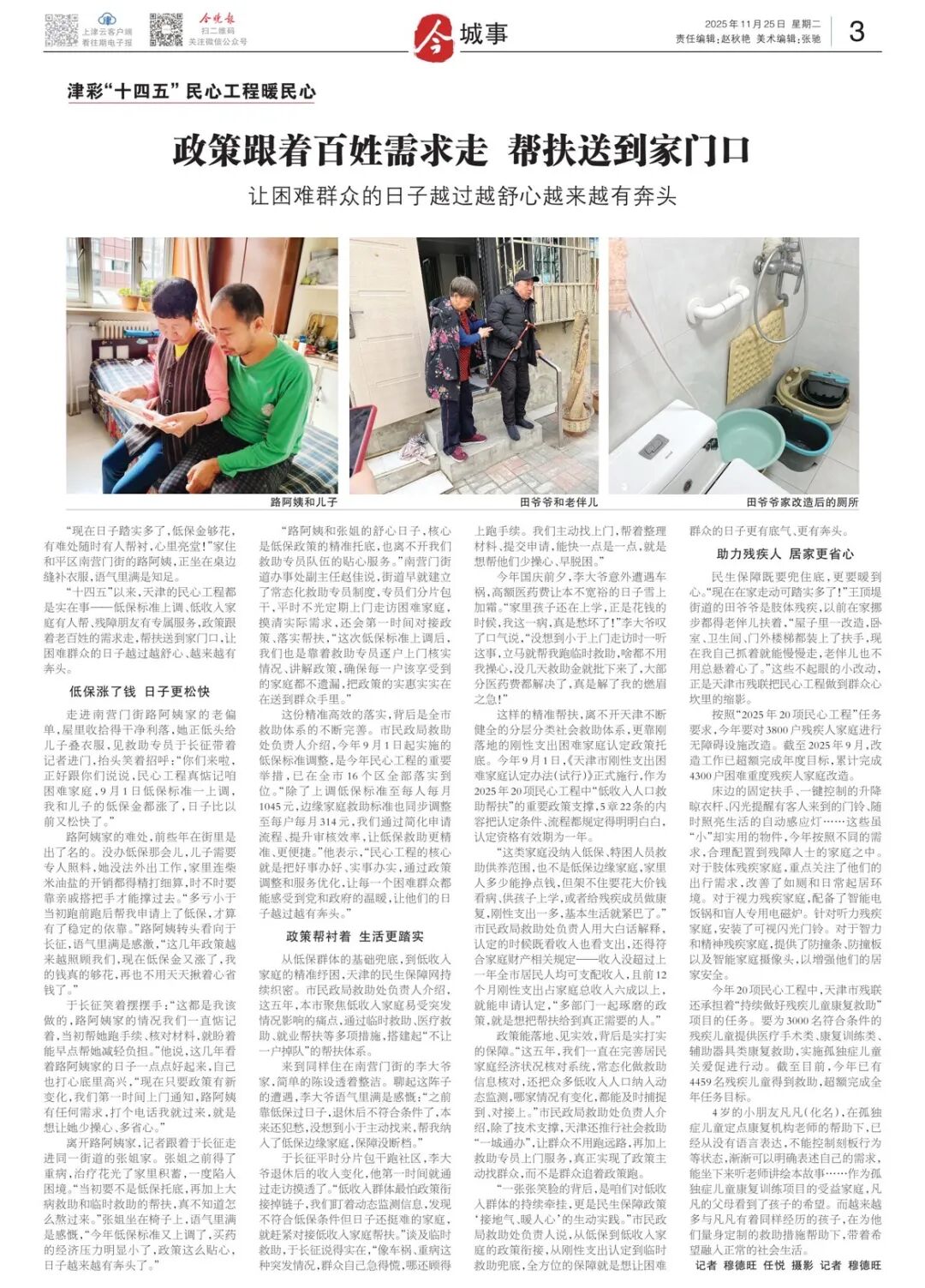 “十四五”以来,天津的民心工程都是实在事——低保标准上调、低收入家庭有人帮、残障朋友有专属服务,政策跟着老百姓的需求走,帮扶送到家门口,让困难群众的日子越过越舒心、越来越有奔头。
