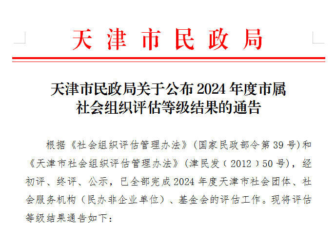 天津市民政局关于公布2024年度市属社会组织评估等级结果的通告