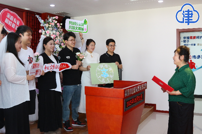 在西青区民政局婚姻登记处,一对对新人早早地前来等候。现场许多新人手持鲜花、头戴白纱,甚至自带摄影师跟拍,将登记仪式变成“小型婚礼”。当天,西青区民政局还特别举办了一场仪式感满满的“创建和谐家庭”集体颁证活动,为新人们的爱情之旅按下了“浪漫启动键”。