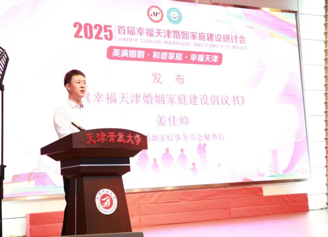 活动尾声,天津市婚姻家庭事务协会秘书长姜佳帅发布《幸福天津婚姻家庭倡议书》,倡议全体市民树立健康婚恋观、重视家庭角色责任、主动学习家庭经营知识、传承良好家风、共建和谐家庭,共同为建设“幸福天津”贡献家庭力量。