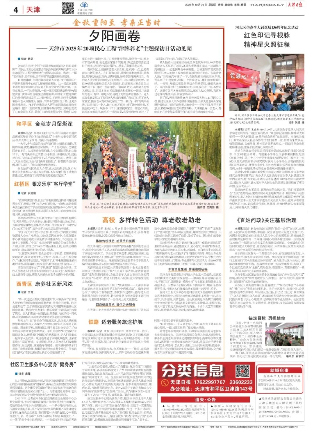 您知道在天津“夕阳”生活是怎样的画卷吗?昨日(10月29日)是重阳节,市民心工程办公室联合市民政局组织开展天津市2025年20项民心工程“津牌养老”主题探访日活动。活动中,一幅“老有所养、老有所乐、老有所安”的温馨画卷徐徐展开。
