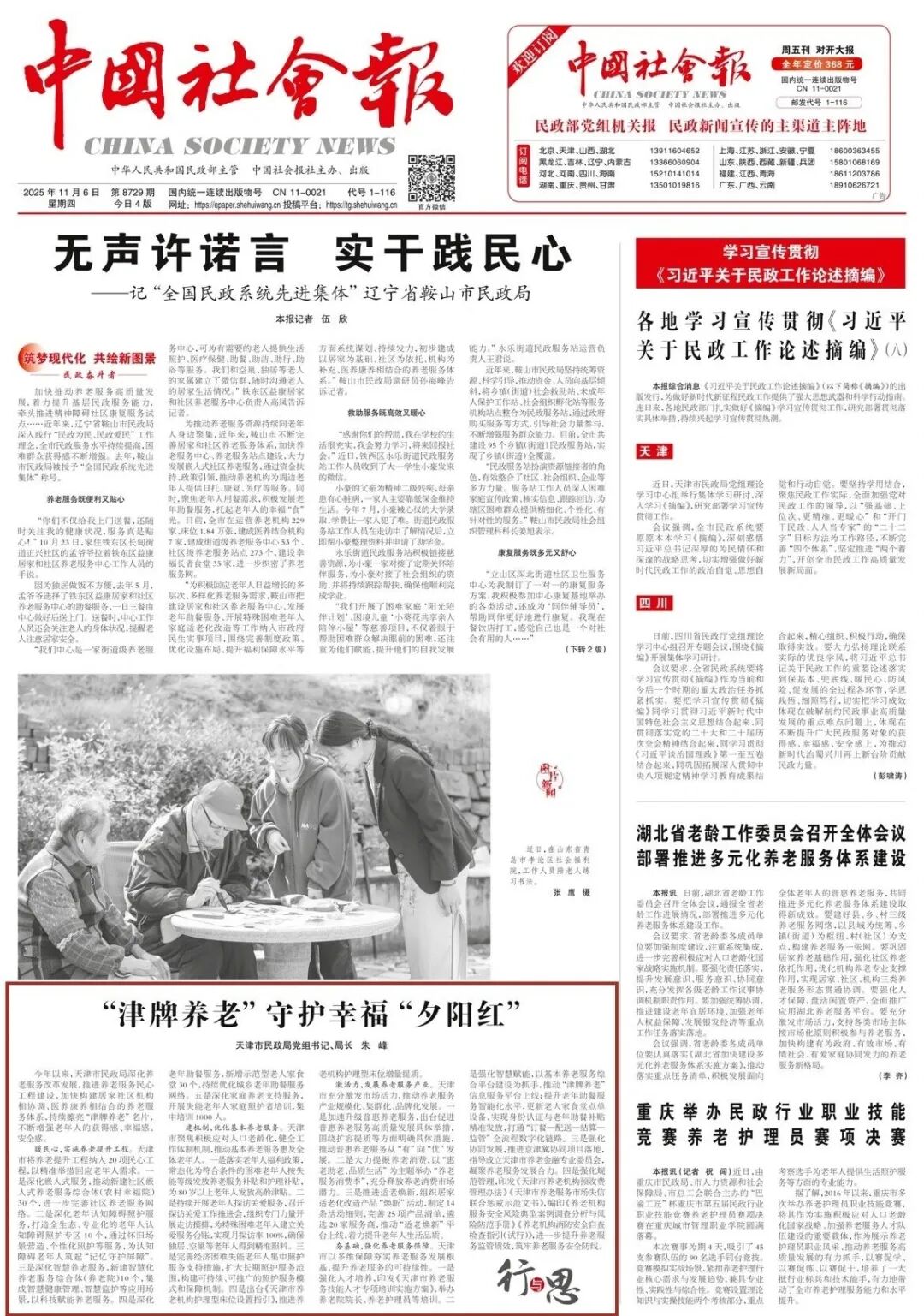 夯基础,强化养老服务保障。天津市以多维保障夯实养老服务发展根基,提升养老服务的可持续性。一是强化人才培养,印发《天津市养老服务技能人才专项培训实施方案》,举办养老院院长、养老护理员等培训。二是强化智慧赋能,以基本养老服务综合平台建设为抓手,推动“津牌养老”信息服务平台上线;提升老年助餐服务智能化水平,更新老人家食堂点单设备,实现身份认证与老年助餐补贴精准发放,打通“订餐—配送—结算—监管”全流程数字化链路。三是强化协同发展,推进京津冀协同项目落地,指导成立天津市养老金融专业委员会,凝聚养老服务发展合力。四是强化规范管理,印发《天津市养老机构预收费管理办法》《天津市养老服务市场失信联合惩戒示范文书》,编印《养老机构服务安全风险典型案例调查分析与风险防范手册》《养老机构消防安全自查检查指引(试行)》,进一步提升养老服务监管质效,筑牢养老服务安全防线。