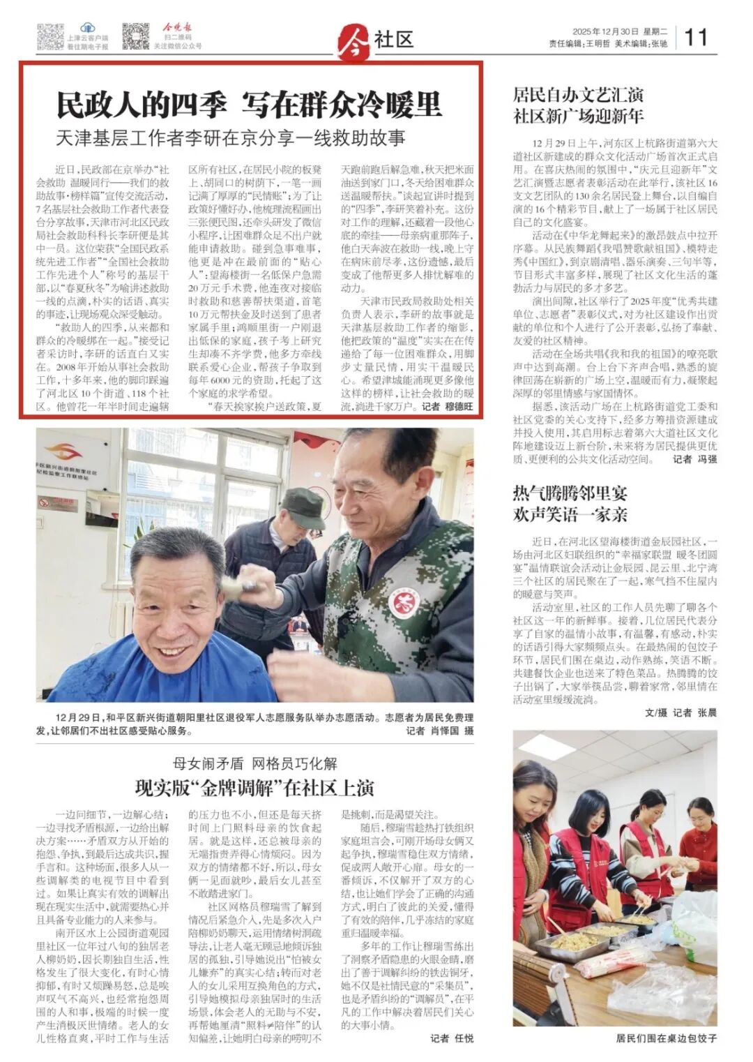 天津市民政局救助处相关负责人表示,李研的故事就是天津基层救助工作者的缩影,他把政策的“温度”实实在在传递给了每一位困难群众,用脚步丈量民情,用实干温暖民心。希望津城能涌现更多像他这样的榜样,让社会救助的暖流,淌进千家万户。