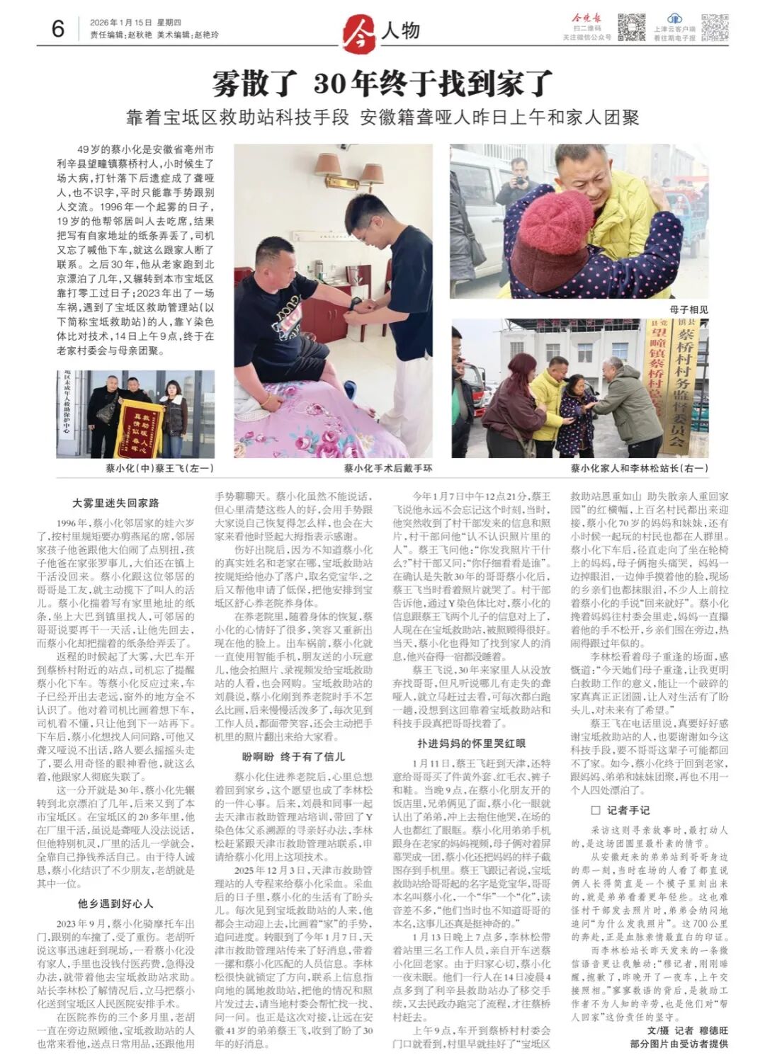 49岁的蔡小化是安徽省亳州市利辛县望疃镇蔡桥村人,小时候生了场大病,打针落下后遗症成了聋哑人,也不识字,平时只能靠手势跟别人交流。1996年一个起雾的日子,19岁的他帮邻居叫人去吃席,结果把写有自家地址的纸条弄丢了,司机又忘了喊他下车,就这么跟家人断了联系。之后30年,他从老家跑到北京漂泊了几年,又辗转到本市宝坻区靠打零工过日子;2023年出了一场车祸,遇到了宝坻区救助管理站(以下简称宝坻救助站)的人,靠Y染色体比对技术,14日上午9点,终于在老家村委会与母亲团聚。