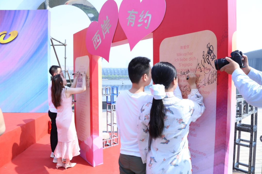 活动现场,集体庆典仪式在喜庆浪漫的氛围中举行,新人们在《西岸有约—“我爱你”万国语留言墙》上留下美好寄语。