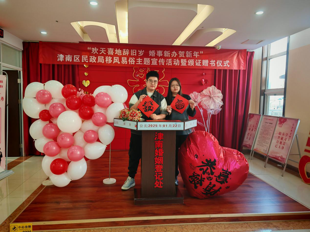 1月22日是中国传统节日俗称“小年”,在这个充满温馨与希望,洋溢着浓郁传统文化气息的日子里,津南区民政局婚姻收养登记处成为了爱与文明的汇聚地。一场以 “欢天喜地辞旧岁 婚事新办贺新年” 为主题的移风易俗宣传活动暨颁证赠书仪式在这里举行,不仅为步入婚姻殿堂的新人们送上了特别祝福,更以实际行动推动了婚俗新风尚在社会的广泛传播。