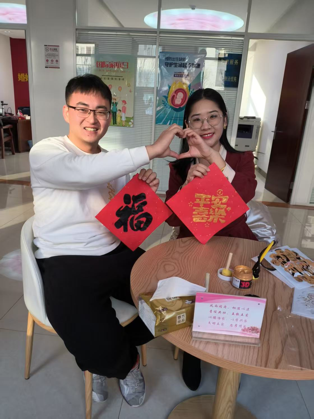 上午九点,局领导和工作人员热情地迎接每一对新人,带领新人体验中华民族非遗文化——拓印,在双方携手完成过程中,寄托了新人对新年和美好婚姻生活的祝福和期盼,为未来的家庭幸福奠定坚实的基础。颁证仪式开始,登记处负责人发表了热情洋溢的致辞,强调此次活动对于推动婚俗改革、弘扬文明新风的重要性。“婚姻不仅是两个人的结合,更是两个家庭的融合,希望新人们能够在这个特殊的日子里,许下对彼此、对家庭的庄重承诺,以实际行动践行婚事新办,为社会树立榜样。” 这番话语,让在场的每一位新人都深受触动。活动中,双新街优秀共产党员、关爱退役军人协会副会长,天津市最美家庭代表、天津市老战士宣讲团成员张金林作为特邀颁证师与区民政局领导庄重地为新人们颁发结婚证书,分享经营家庭生活的经验。之后,新人们怀着无比激动的心情共同宣读结婚誓言,这一情景新人们将永远铭记,终身难忘。接下来,心理辅导老师引导新人们在创建美好家庭生活中共同成长,共同肩负起对婚姻家庭的责任。