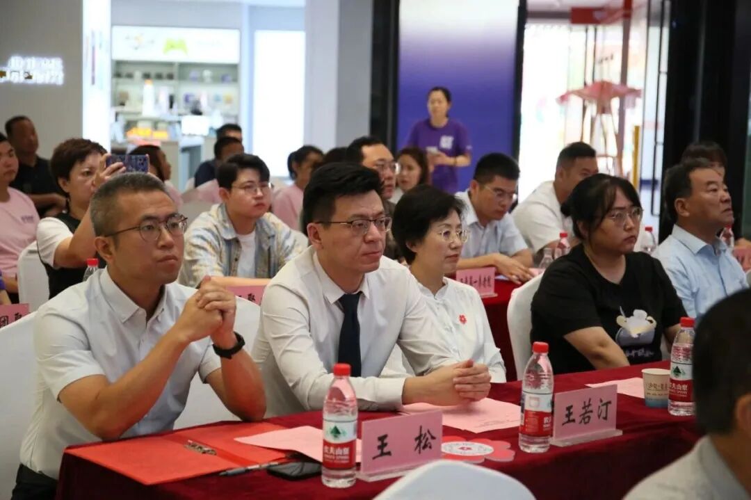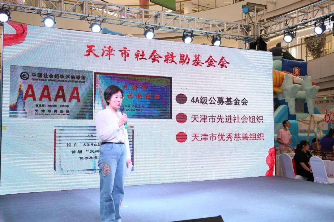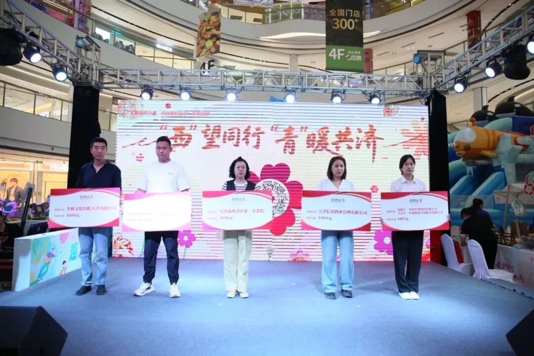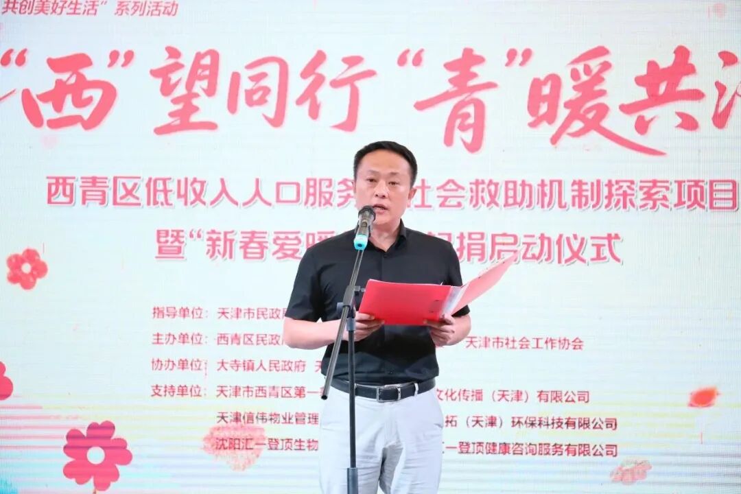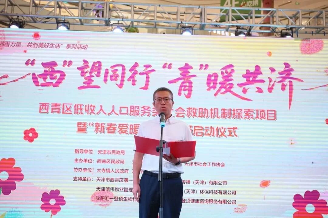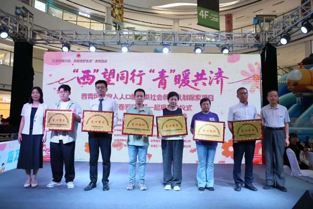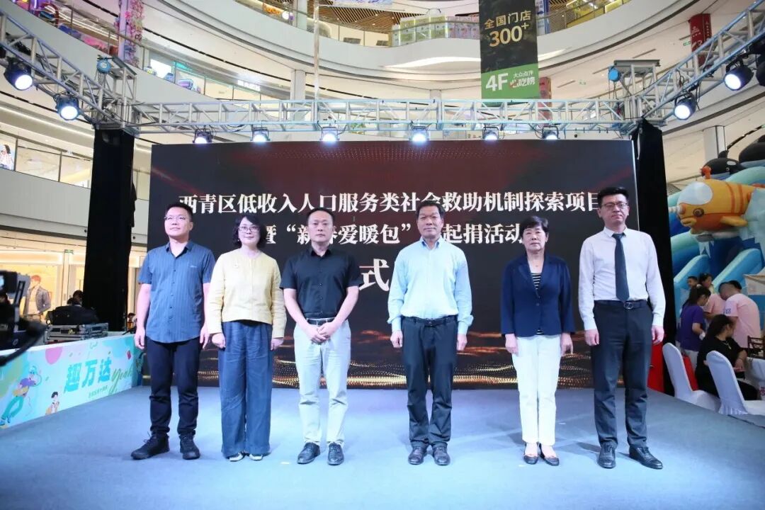 市民政局社会救助处副处长杨晓峰、西青区民政局党组书记、局长龙万兴、天津市社会救助基金会副会长李瑶、天津市社会工作协会会长杨丽荣、西青区大寺镇副镇长付作光、天津西青万达广场总经理王若汀共同上台启动项目。