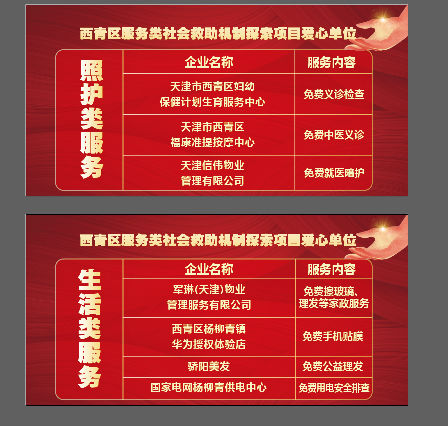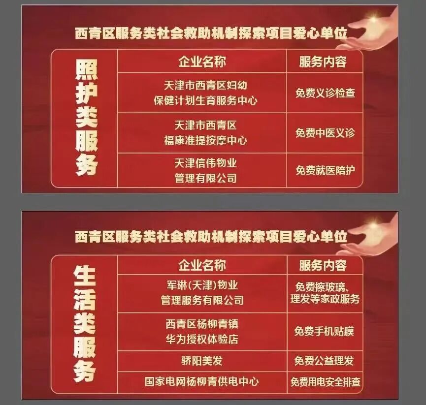 活动现场发布了《西青区服务类社会救助机制探索项目爱心单位》名录,并公布了新一批加入的爱心单位名单,分别是:中国农业银行天津西青支行、天津市西青区爱星筑梦公益服务中心、天津福聚盛养老服务有限公司、天津市西青区因爱团聚少儿成长公益社、天津市西青万达广场、天津河西贝皓卓越口腔诊所。区民政局党组副书记李静欣与南开大学社会学教授、天津市社会工作协会副会长唐忠新向爱心单位代表授牌,以表彰其用实际行动履行社会责任,用公益善举传递城市温度的示范行为。